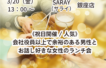 募集中 銀座 2026.03.20 / 13:00 〜 amici 【銀座】《祝日開催/人気》会社役員以上で余裕のある男性とお話し好きな女性のランチ会 初めての方でも参加しやすい、銀座でランチ会開催します!!優雅な空間でのお食事をお楽しみください! 会場 サライ…